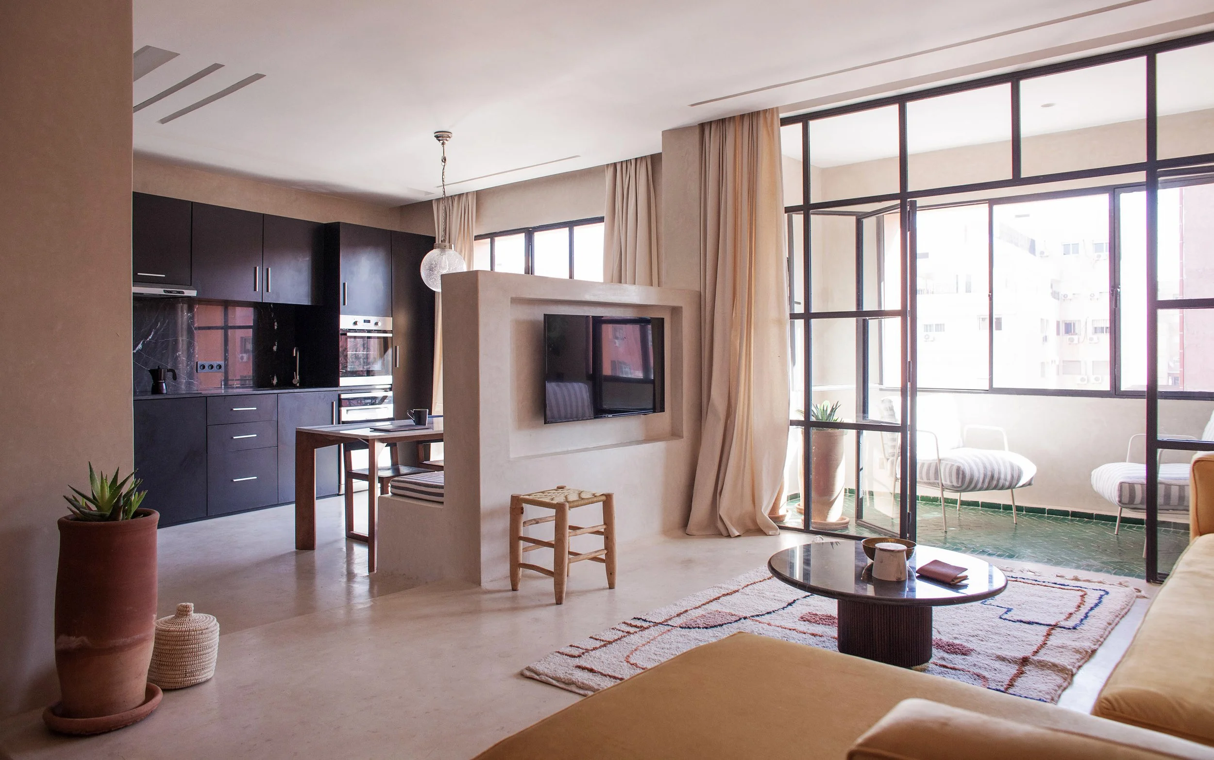 L’appartement Ballroom a fait l’objet d’une restructuration complète afin de créer un espace de vie ouvert, fluide et convivial. L’intégration d’une alcôve confère au séjour une dimension à la fois structurée et intimiste, tandis que la cuisine s’ouvre pleinement sur le salon et se prolonge par un coin repas doté d’une assise bâtie.